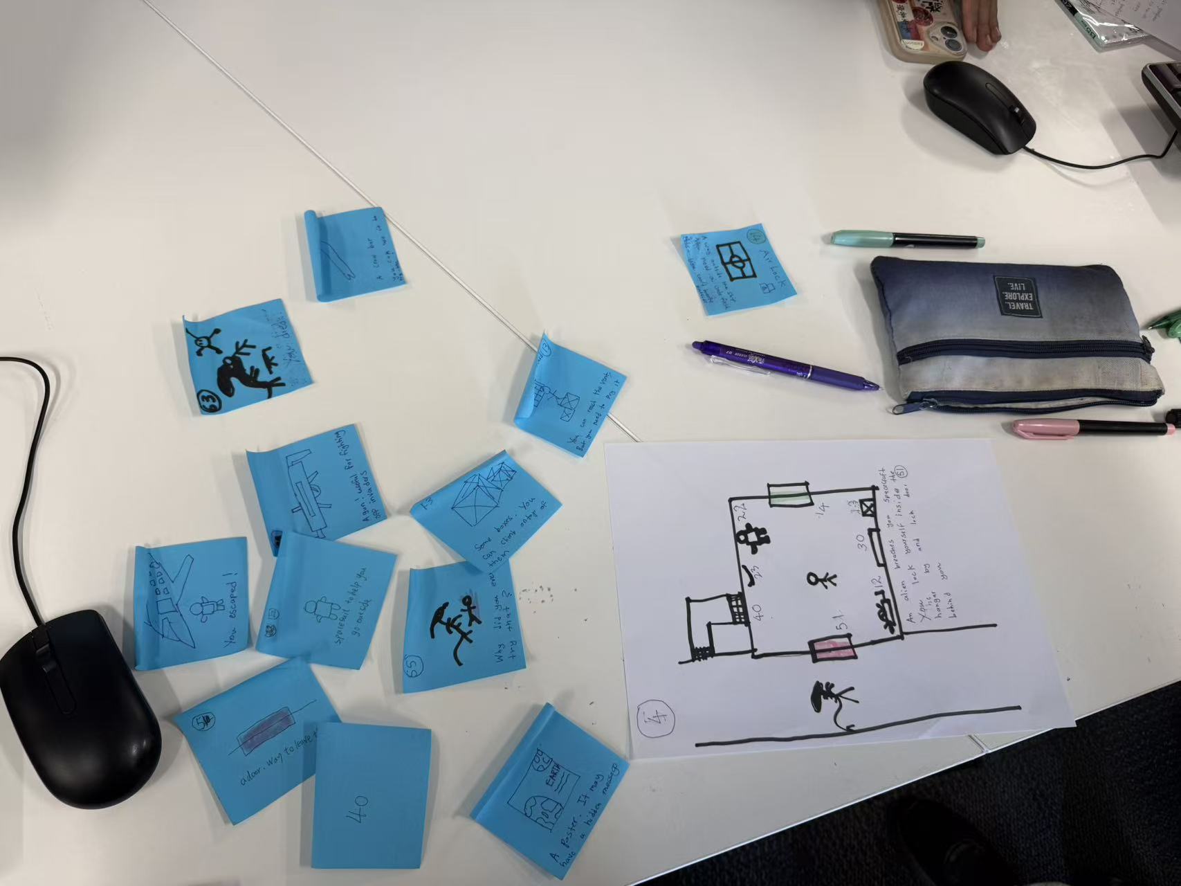 首先,我们确定了太空站的主题,因为这个环境非常适合解谜逃脱游戏。在设计过程中,我想到如果游戏有多种不同的结局,比如被外星人吃掉、与外星人战斗或成功逃脱,可能会更有趣。基于这个结局构想,我们开始着手设计与不同结局相符的道具,以及多套互动卡片。故事情节还融入了密码和手机的互动元素,以增强玩家的游戏体验。